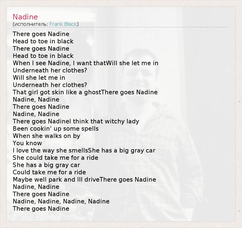 There goes Nadine Head to toe in black There goes Nadine Head to toe in black When I see Nadine, I want thatWill she let me in Underneath her clothes? Will she let me in Underneath her clothes? That girl got skin like a ghostThere goes Nadine Nadine, Nadine There goes Nadine Nadine, Nadine There goes NadineI think that witchy lady Been cookin' up some spells When she walks on by You know I love the way she smellsShe has a big gray car She could take me for a ride She has a big gray car Could take me for a ride Maybe well park and Ill driveThere goes Nadine Nadine, Nadine There goes Nadine Nadine, Nadine, Nadine, Nadine There goes Nadine