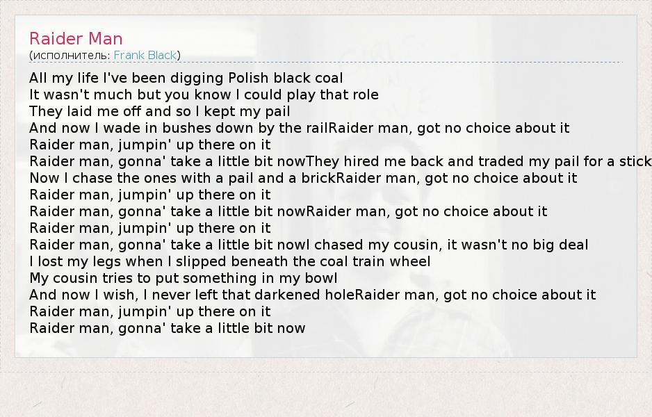 Raider man, gonna' take a little bit nowRaider man, got no choice about it