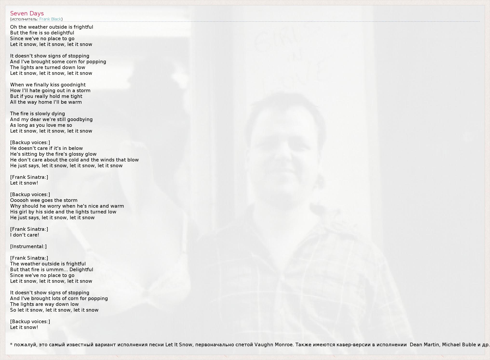 Oh the weather outside is frightful But the fire is so delightful Since we've no place to go Let it snow, let it snow, let it snow It doesn't show signs of stopping And I've brought some corn for popping The lights are turned down low Let it snow, let it snow, let it snow When we finally kiss goodnight How I'll hate going out in a storm But if you really hold me tight All the way home I'll be warm The fire is slowly dying And my dear we're still goodbying As long as you love me so Let it snow, let it snow, let it snow [Backup voices:] He doesn't care if it's in below He's sitting by the fire's glossy glow He don't care about the cold and the winds that blow He just says, let it snow, let it snow, let it snow [Frank Sinatra:] Let it snow! [Backup voices:] Oooooh wee goes the storm Why should he worry when he's nice and warm His girl by his side and the lights turned low He just says, let it snow, let it snow [Frank Sinatra:] I don't care! [Instrumental:] [Frank Sinatra:] The weather outside is frightful But that fire is ummm... Delightful Since we've no place to go Let it snow, let it snow, let it snow It doesn't show signs of stopping And I've brought lots of corn for popping The lights are way down low So let it snow, let it snow, let it snow [Backup voices:] Let it snow! * пожалуй, это самый известный вариант исполнения песни Let It Snow, первоначально спетой Vaughn Monroe. Также имеются кавер-версии в исполнении Dean Martin, Michael Buble и др.