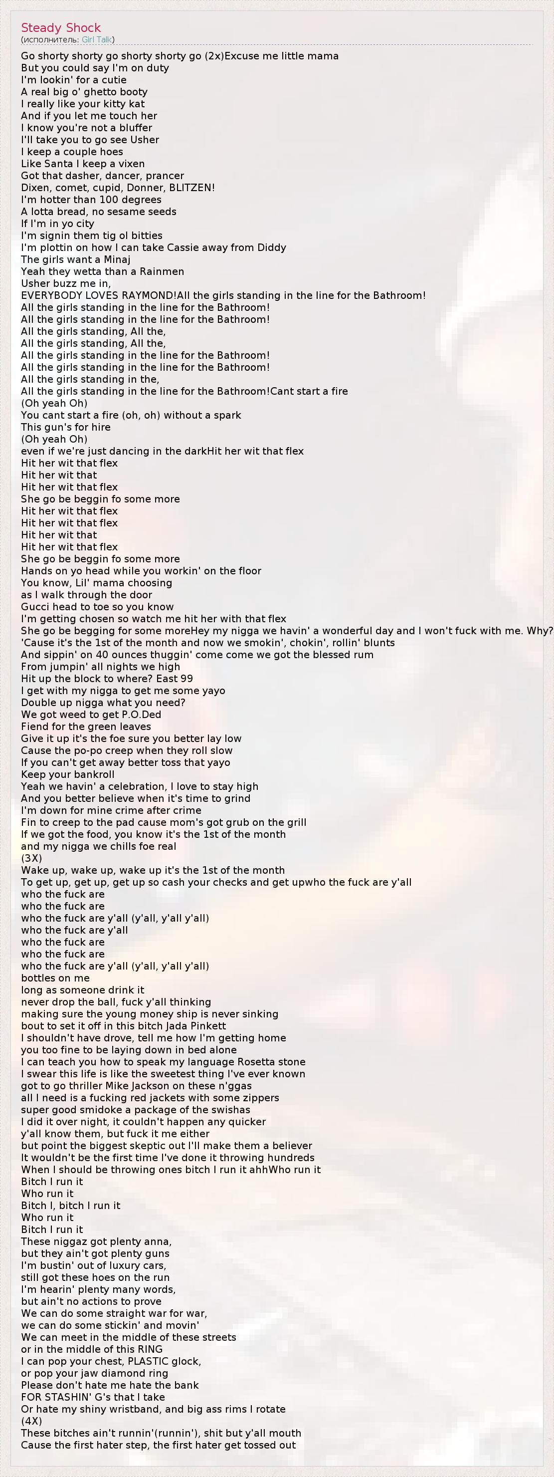 Go shorty shorty go shorty shorty go (2x)Excuse me little mama But you could say I'm on duty I'm lookin' for a cutie A real big o' ghetto booty I really like your kitty kat And if you let me touch her I know you're not a bluffer I'll take you to go see Usher I keep a couple hoes Like Santa I keep a vixen Got that dasher, dancer, prancer Dixen, comet, cupid, Donner, BLITZEN! I'm hotter than 100 degrees A lotta bread, no sesame seeds If I'm in yo city I'm signin them tig ol bitties I'm plottin on how I can take Cassie away from Diddy The girls want a Minaj Yeah they wetta than a Rainmen Usher buzz me in, EVERYBODY LOVES RAYMOND!All the girls standing in the line for the Bathroom! All the girls standing in the line for the Bathroom! All the girls standing in the line for the Bathroom! All the girls standing, All the, All the girls standing, All the, All the girls standing in the line for the Bathroom! All the girls standing in the line for the Bathroom! All the girls standing in the, All the girls standing in the line for the Bathroom!Cant start a fire (Oh yeah Oh) You cant start a fire (oh, oh) without a spark This gun's for hire (Oh yeah Oh) even if we're just dancing in the darkHit her wit that flex Hit her wit that flex Hit her wit that Hit her wit that flex She go be beggin fo some more Hit her wit that flex Hit her wit that flex Hit her wit that Hit her wit that flex She go be beggin fo some more Hands on yo head while you workin' on the floor You know, Lil' mama choosing as I walk through the door Gucci head to toe so you know I'm getting chosen so watch me hit her with that flex She go be begging for some moreHey my nigga we havin' a wonderful day and I won't fuck with me. Why? 'Cause it's the 1st of the month and now we smokin', chokin', rollin' blunts And sippin' on 40 ounces thuggin' come come we got the blessed rum From jumpin' all nights we high Hit up the block to where? East 99 I get with my nigga to get me some yayo Double up nigga what you need? We got weed to get P.O.Ded Fiend for the green leaves Give it up it's the foe sure you better lay low Cause the po-po creep when they roll slow If you can't get away better toss that yayo Keep your bankroll Yeah we havin' a celebration, I love to stay high And you better believe when it's time to grind I'm down for mine crime after crime Fin to creep to the pad cause mom's got grub on the grill If we got the food, you know it's the 1st of the month and my nigga we chills foe real (3X) Wake up, wake up, wake up it's the 1st of the month To get up, get up, get up so cash your checks and get upwho the fuck are y'all who the fuck are who the fuck are who the fuck are y'all (y'all, y'all y'all) who the fuck are y'all who the fuck are who the fuck are who the fuck are y'all (y'all, y'all y'all) bottles on me long as someone drink it never drop the ball, fuck y'all thinking making sure the young money ship is never sinking bout to set it off in this bitch Jada Pinkett I shouldn't have drove, tell me how I'm getting home you too fine to be laying down in bed alone I can teach you how to speak my language Rosetta stone I swear this life is like the sweetest thing I've ever known got to go thriller Mike Jackson on these n'ggas all I need is a fucking red jackets with some zippers super good smidoke a package of the swishas I did it over night, it couldn't happen any quicker y'all know them, but fuck it me either but point the biggest skeptic out I'll make them a believer It wouldn't be the first time I've done it throwing hundreds When I should be throwing ones bitch I run it ahhWho run it Bitch I run it Who run it Bitch I, bitch I run it Who run it Bitch I run it These niggaz got plenty anna, but they ain't got plenty guns I'm bustin' out of luxury cars, still got these hoes on the run I'm hearin' plenty many words, but ain't no actions to prove We can do some straight war for war, we can do some stickin' and movin' We can meet in the middle of these streets or in the middle of this RING I can pop your chest, PLASTIC glock, or pop your jaw diamond ring Please don't hate me hate the bank FOR STASHIN' G's that I take Or hate my shiny wristband, and big ass rims I rotate (4X) These bitches ain't runnin'(runnin'), shit but y'all mouth Cause the first hater step, the first hater get tossed out