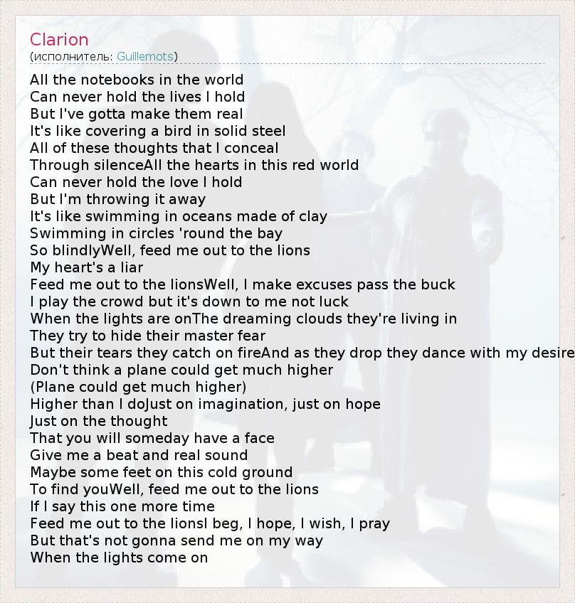 All the notebooks in the world Can never hold the lives I hold But I've gotta make them real It's like covering a bird in solid steel All of these thoughts that I conceal Through silenceAll the hearts in this red world Can never hold the love I hold But I'm throwing it away It's like swimming in oceans made of clay Swimming in circles 'round the bay So blindlyWell, feed me out to the lions My heart's a liar Feed me out to the lionsWell, I make excuses pass the buck I play the crowd but it's down to me not luck When the lights are onThe dreaming clouds they're living in They try to hide their master fear But their tears they catch on fireAnd as they drop they dance with my desire Don't think a plane could get much higher (Plane could get much higher) Higher than I doJust on imagination, just on hope Just on the thought That you will someday have a face Give me a beat and real sound Maybe some feet on this cold ground To find youWell, feed me out to the lions If I say this one more time Feed me out to the lionsI beg, I hope, I wish, I pray But that's not gonna send me on my way When the lights come on