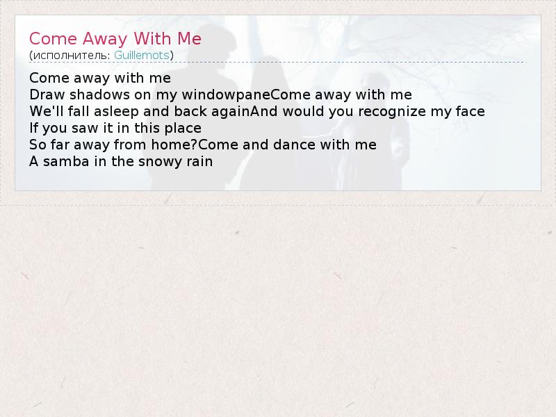 Come away with me Draw shadows on my windowpaneCome away with me We'll fall asleep and back againAnd would you recognize my face If you saw it in this place So far away from home?Come and dance with me A samba in the snowy rain
