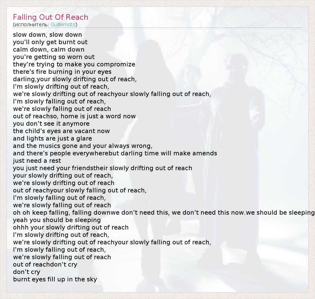 slow down, slow down you'll only get burnt out calm down, calm down you're getting so worn out they're trying to make you compromize there's fire burning in your eyes darling,your slowly drifting out of reach, I'm slowly drifting out of reach, we're slowly drifting out of reachyour slowly falling out of reach, I'm slowly falling out of reach, we're slowly falling out of reach out of reachso, home is just a word now you don't see it anymore the child's eyes are vacant now and lights are just a glare and the musics gone and your always wrong, and there's people everywherebut darling time will make amends just need a rest you just need your friendstheir slowly drifting out of reach your slowly drifting out of reach, we're slowly drifting out of reach out of reachyour slowly falling out of reach, I'm slowly falling out of reach, we're slowly falling out of reach oh oh keep falling, falling downwe don't need this, we don't need this now.we should be sleeping yeah you should be sleeping ohhh your slowly drifting out of reach I'm slowly drifting out of reach, we're slowly drifting out of reachyour slowly falling out of reach, I'm slowly falling out of reach, we're slowly falling out of reach out of reachdon't cry don't cry burnt eyes fill up in the sky