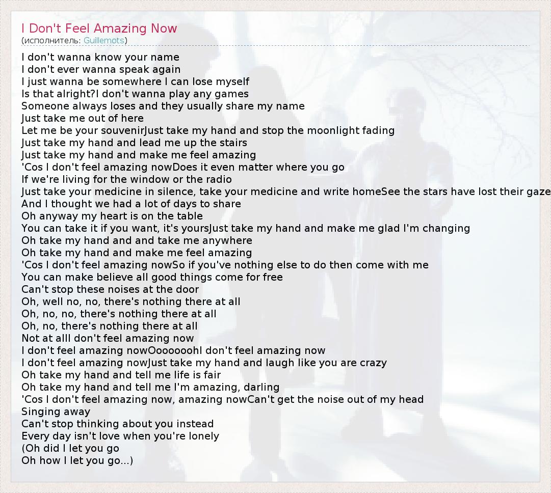 I don't feel amazing nowOoooooohI don't feel amazing now