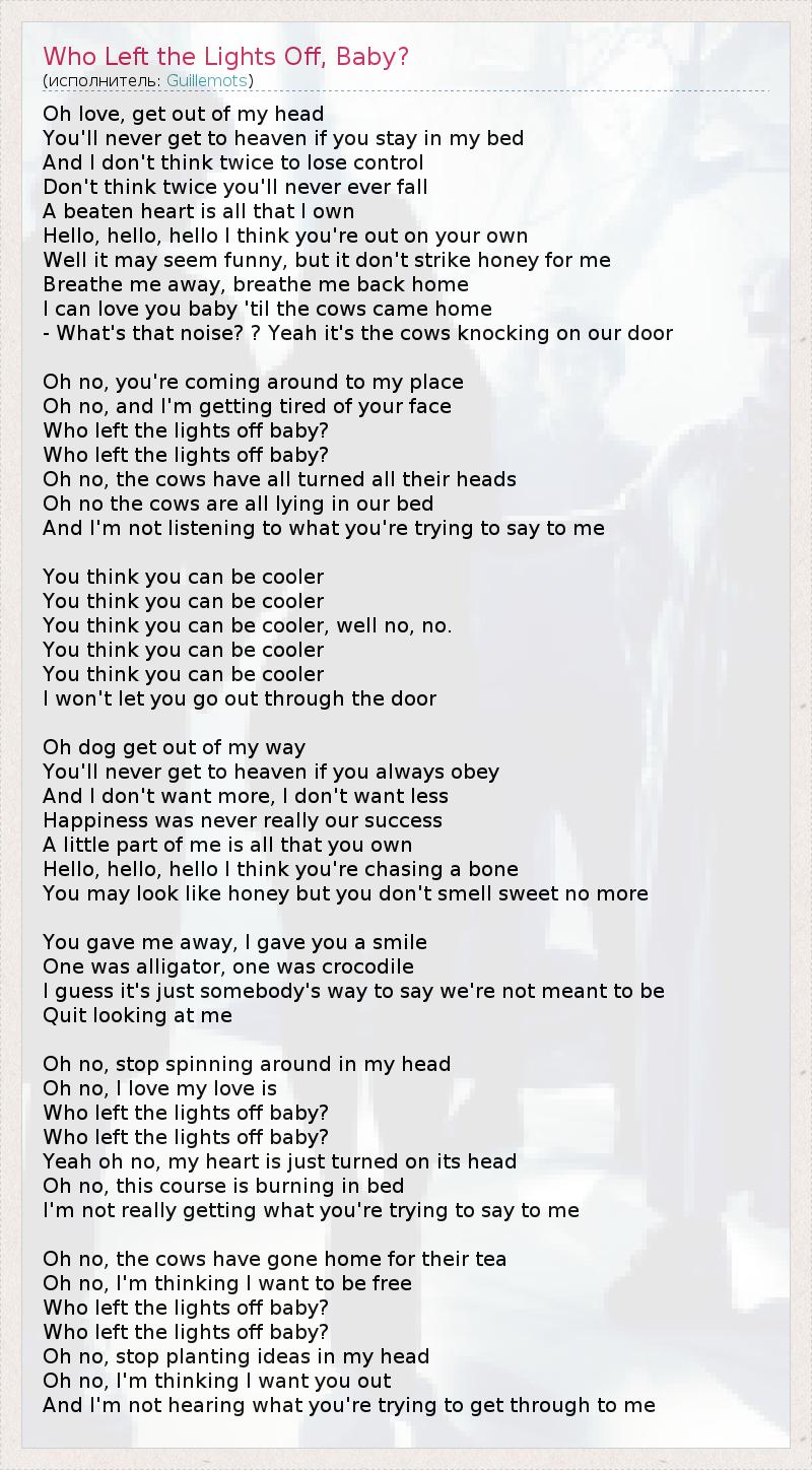 Oh love, get out of my head You'll never get to heaven if you stay in my bed And I don't think twice to lose control Don't think twice you'll never ever fall A beaten heart is all that I own Hello, hello, hello I think you're out on your own Well it may seem funny, but it don't strike honey for me Breathe me away, breathe me back home I can love you baby 'til the cows came home - What's that noise? ? Yeah it's the cows knocking on our door Oh no, you're coming around to my place Oh no, and I'm getting tired of your face Who left the lights off baby? Who left the lights off baby? Oh no, the cows have all turned all their heads Oh no the cows are all lying in our bed And I'm not listening to what you're trying to say to me You think you can be cooler You think you can be cooler You think you can be cooler, well no, no. You think you can be cooler You think you can be cooler I won't let you go out through the door Oh dog get out of my way You'll never get to heaven if you always obey And I don't want more, I don't want less Happiness was never really our success A little part of me is all that you own Hello, hello, hello I think you're chasing a bone You may look like honey but you don't smell sweet no more You gave me away, I gave you a smile One was alligator, one was crocodile I guess it's just somebody's way to say we're not meant to be Quit looking at me Oh no, stop spinning around in my head Oh no, I love my love is Who left the lights off baby? Who left the lights off baby? Yeah oh no, my heart is just turned on its head Oh no, this course is burning in bed I'm not really getting what you're trying to say to me Oh no, the cows have gone home for their tea Oh no, I'm thinking I want to be free Who left the lights off baby? Who left the lights off baby? Oh no, stop planting ideas in my head Oh no, I'm thinking I want you out And I'm not hearing what you're trying to get through to me