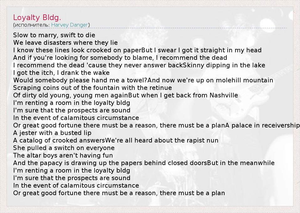 Slow to marry, swift to die We leave disasters where they lie I know these lines look crooked on paperBut I swear I got it straight in my head And if you're looking for somebody to blame, I recommend the dead I recommend the dead 'cause they never answer backSkinny dipping in the lake I got the itch, I drank the wake Would somebody please hand me a towel?And now we're up on molehill mountain Scraping coins out of the fountain with the retinue Of dirty old young, young men againBut when I get back from Nashville I'm renting a room in the loyalty bldg I'm sure that the prospects are sound In the event of calamitous circumstance Or great good fortune there must be a reason, there must be a planA palace in receivership A jester with a busted lip A catalog of crooked answersWe're all heard about the rapist nun She pulled a switch on everyone The altar boys aren't having fun And the papacy is drawing up the papers behind closed doorsBut in the meanwhile I'm renting a room in the loyalty bldg I'm sure that the prospects are sound In the event of calamitous circumstance Or great good fortune there must be a reason, there must be a plan