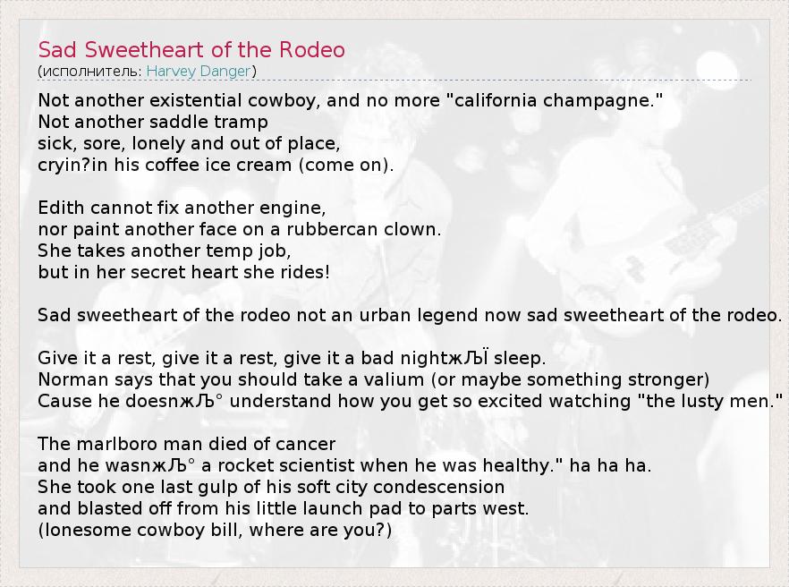 А как ты думаешь, о чем песня "Sad Sweetheart of the Rodeo" ?