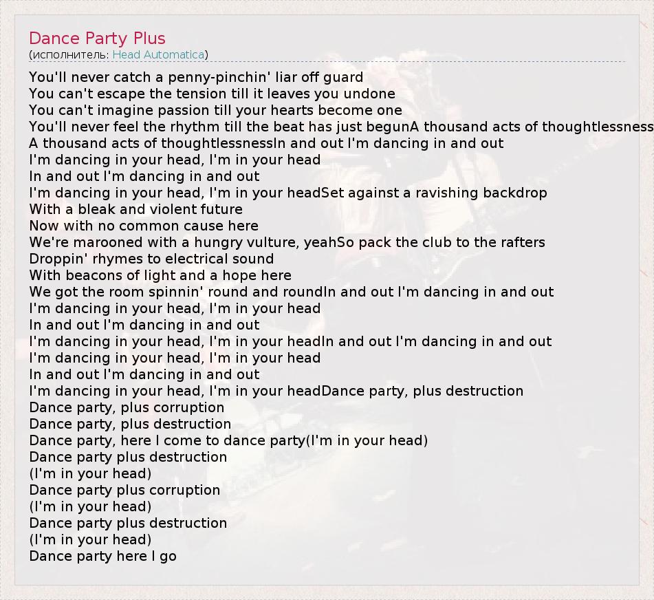 You'll never catch a penny-pinchin' liar off guard You can't escape the tension till it leaves you undone You can't imagine passion till your hearts become one You'll never feel the rhythm till the beat has just begunA thousand acts of thoughtlessness A thousand acts of thoughtlessnessIn and out I'm dancing in and out I'm dancing in your head, I'm in your head In and out I'm dancing in and out I'm dancing in your head, I'm in your headSet against a ravishing backdrop With a bleak and violent future Now with no common cause here We're marooned with a hungry vulture, yeahSo pack the club to the rafters Droppin' rhymes to electrical sound With beacons of light and a hope here We got the room spinnin' round and roundIn and out I'm dancing in and out I'm dancing in your head, I'm in your head In and out I'm dancing in and out I'm dancing in your head, I'm in your headIn and out I'm dancing in and out I'm dancing in your head, I'm in your head In and out I'm dancing in and out I'm dancing in your head, I'm in your headDance party, plus destruction Dance party, plus corruption Dance party, plus destruction Dance party, here I come to dance party(I'm in your head) Dance party plus destruction (I'm in your head) Dance party plus corruption (I'm in your head) Dance party plus destruction (I'm in your head) Dance party here I go