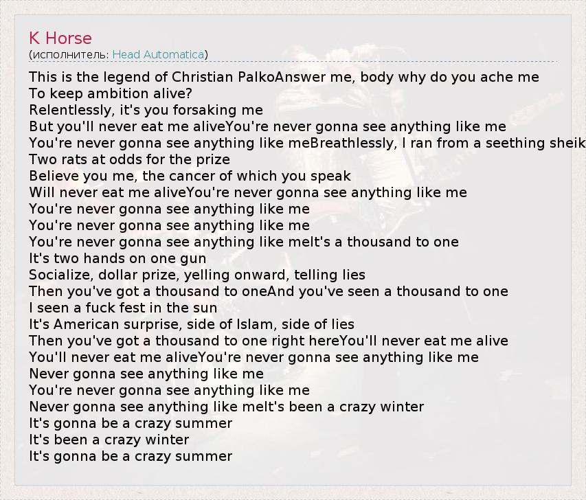 This is the legend of Christian PalkoAnswer me, body why do you ache me To keep ambition alive? Relentlessly, it's you forsaking me But you'll never eat me aliveYou're never gonna see anything like me You're never gonna see anything like meBreathlessly, I ran from a seething sheik Two rats at odds for the prize Believe you me, the cancer of which you speak Will never eat me aliveYou're never gonna see anything like me You're never gonna see anything like me You're never gonna see anything like me You're never gonna see anything like meIt's a thousand to one It's two hands on one gun Socialize, dollar prize, yelling onward, telling lies Then you've got a thousand to oneAnd you've seen a thousand to one I seen a fuck fest in the sun It's American surprise, side of Islam, side of lies Then you've got a thousand to one right hereYou'll never eat me alive You'll never eat me aliveYou're never gonna see anything like me Never gonna see anything like me You're never gonna see anything like me Never gonna see anything like meIt's been a crazy winter It's gonna be a crazy summer It's been a crazy winter It's gonna be a crazy summer
