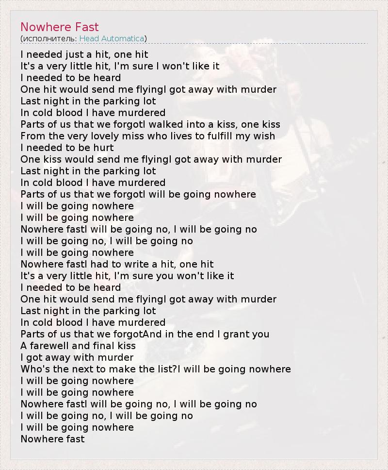 I needed just a hit, one hit It's a very little hit, I'm sure I won't like it I needed to be heard One hit would send me flyingI got away with murder Last night in the parking lot In cold blood I have murdered Parts of us that we forgotI walked into a kiss, one kiss From the very lovely miss who lives to fulfill my wish I needed to be hurt One kiss would send me flyingI got away with murder Last night in the parking lot In cold blood I have murdered Parts of us that we forgotI will be going nowhere I will be going nowhere I will be going nowhere Nowhere fastI will be going no, I will be going no I will be going no, I will be going no I will be going nowhere Nowhere fastI had to write a hit, one hit It's a very little hit, I'm sure you won't like it I needed to be heard One hit would send me flyingI got away with murder Last night in the parking lot In cold blood I have murdered Parts of us that we forgotAnd in the end I grant you A farewell and final kiss I got away with murder Who's the next to make the list?I will be going nowhere I will be going nowhere I will be going nowhere Nowhere fastI will be going no, I will be going no I will be going no, I will be going no I will be going nowhere Nowhere fast