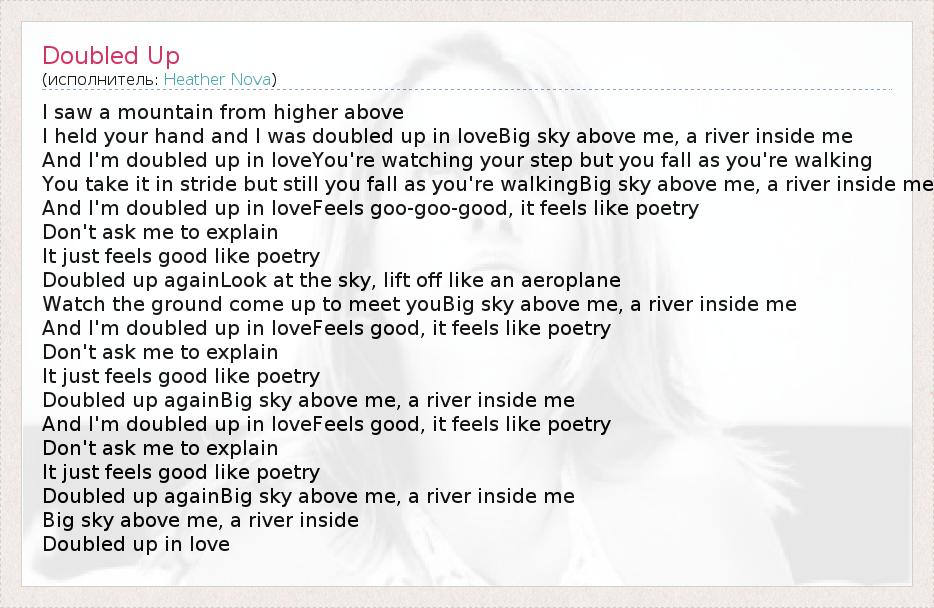 I saw a mountain from higher above I held your hand and I was doubled up in loveBig sky above me, a river inside me And I'm doubled up in loveYou're watching your step but you fall as you're walking You take it in stride but still you fall as you're walkingBig sky above me, a river inside me And I'm doubled up in loveFeels goo-goo-good, it feels like poetry Don't ask me to explain It just feels good like poetry Doubled up againLook at the sky, lift off like an aeroplane Watch the ground come up to meet youBig sky above me, a river inside me And I'm doubled up in loveFeels good, it feels like poetry Don't ask me to explain It just feels good like poetry Doubled up againBig sky above me, a river inside me And I'm doubled up in loveFeels good, it feels like poetry Don't ask me to explain It just feels good like poetry Doubled up againBig sky above me, a river inside me Big sky above me, a river inside Doubled up in love