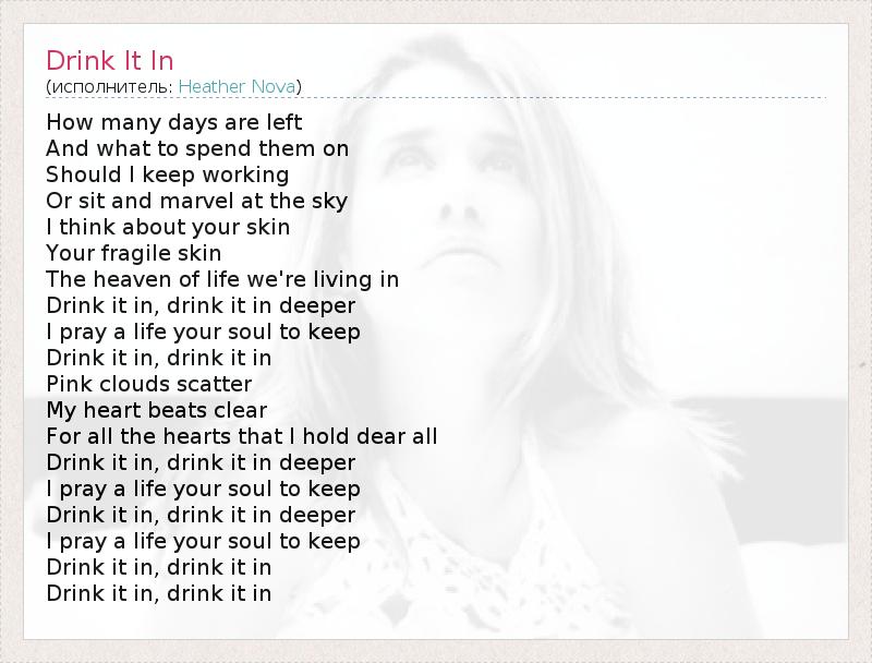 How many days are left And what to spend them on Should I keep working Or sit and marvel at the sky I think about your skin Your fragile skin The heaven of life we're living in Drink it in, drink it in deeper I pray a life your soul to keep Drink it in, drink it in Pink clouds scatter My heart beats clear For all the hearts that I hold dear all Drink it in, drink it in deeper I pray a life your soul to keep Drink it in, drink it in deeper I pray a life your soul to keep Drink it in, drink it in Drink it in, drink it in