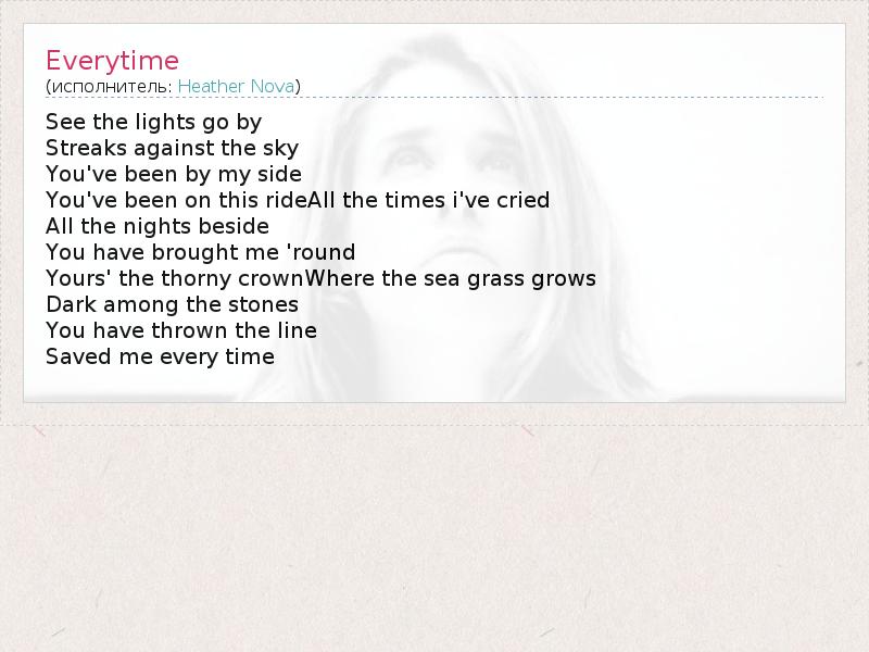 Это интересно:Heather Nova (настоящее имя Heather Allison Frith) родилась на Бермудах 6 июля 1967 года. На скрипке и гитаре Хитер начинает играть рано для своих лет, но первую песню напишет только к 12 годам. После окончания школы в Новой Англии, куда переехала её семья, в 1983 году Хитер поступила в Род-айлендскую школку дизайна (RISD), где она пробует себя в качестве автора сценария к фильмам. Она также посещала занятия по поэзии... продолжение