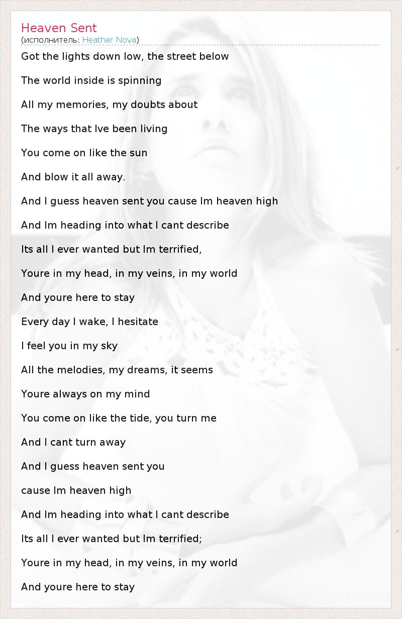 Got the lights down low, the street below The world inside is spinning All my memories, my doubts about The ways that Ive been living You come on like the sun And blow it all away. And I guess heaven sent you cause Im heaven high And Im heading into what I cant describe Its all I ever wanted but Im terrified, Youre in my head, in my veins, in my world And youre here to stay Every day I wake, I hesitate I feel you in my sky All the melodies, my dreams, it seems Youre always on my mind You come on like the tide, you turn me And I cant turn away And I guess heaven sent you cause Im heaven high And Im heading into what I cant describe Its all I ever wanted but Im terrified; Youre in my head, in my veins, in my world And youre here to stay