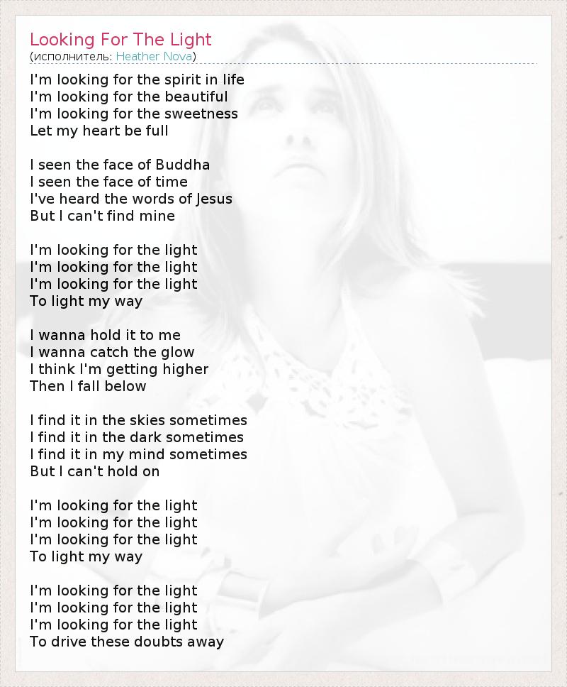 I'm looking for the spirit in life I'm looking for the beautiful I'm looking for the sweetness Let my heart be full I seen the face of Buddha I seen the face of time I've heard the words of Jesus But I can't find mine I'm looking for the light I'm looking for the light I'm looking for the light To light my way I wanna hold it to me I wanna catch the glow I think I'm getting higher Then I fall below I find it in the skies sometimes I find it in the dark sometimes I find it in my mind sometimes But I can't hold on I'm looking for the light I'm looking for the light I'm looking for the light To light my way I'm looking for the light I'm looking for the light I'm looking for the light To drive these doubts away