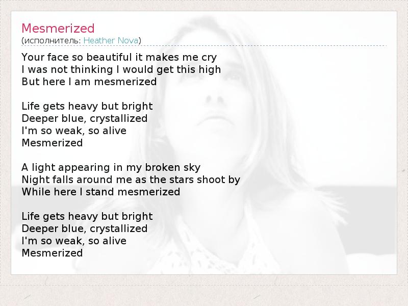 Your face so beautiful it makes me cry I was not thinking I would get this high But here I am mesmerized Life gets heavy but bright Deeper blue, crystallized I'm so weak, so alive Mesmerized A light appearing in my broken sky Night falls around me as the stars shoot by While here I stand mesmerized Life gets heavy but bright Deeper blue, crystallized I'm so weak, so alive Mesmerized
