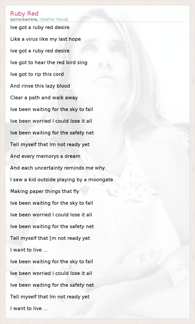 Ive got a ruby red desire Like a virus like my last hope Ive got a ruby red desire Ive got to hear the red bird sing Ive got to rip this cord And rinse this lazy blood Clear a path and walk away Ive been waiting for the sky to fall Ive been worried I could lose it all Ive been waiting for the safety net Tell myself that Im not ready yet And every memorys a dream And each uncertainty reminds me why I saw a kid outside playing by a moongate Making paper things that fly Ive been waiting for the sky to fall Ive been worried I could lose it all Ive been waiting for the safety net Tell myself that [m not ready yet I want to live ... Ive been waiting for the sky to fall Ive been worried I could lose it all Ive been waiting for the safety net Tell myself that Im not ready yet I want to live ...