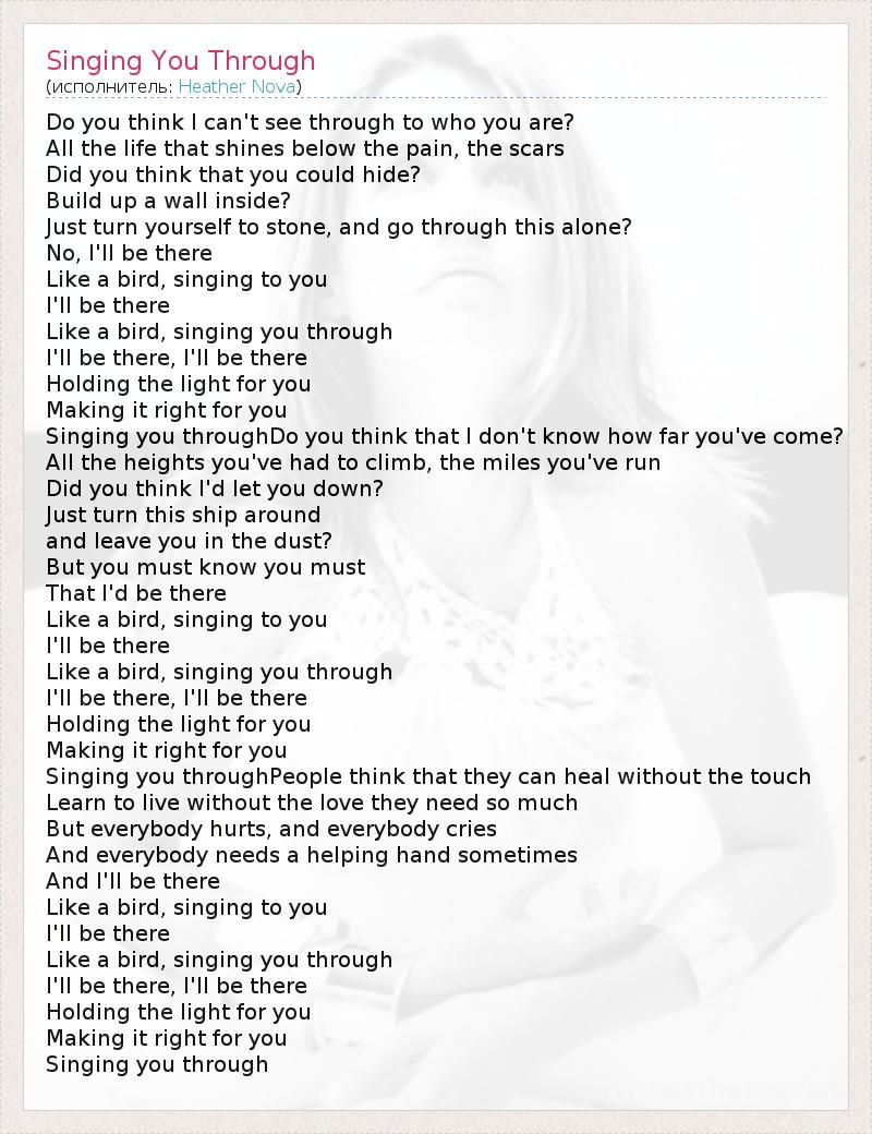 Do you think I can't see through to who you are? All the life that shines below the pain, the scars Did you think that you could hide? Build up a wall inside? Just turn yourself to stone, and go through this alone? No, I'll be there Like a bird, singing to you I'll be there Like a bird, singing you through I'll be there, I'll be there Holding the light for you Making it right for you Singing you throughDo you think that I don't know how far you've come? All the heights you've had to climb, the miles you've run Did you think I'd let you down? Just turn this ship around and leave you in the dust? But you must know you must That I'd be there Like a bird, singing to you I'll be there Like a bird, singing you through I'll be there, I'll be there Holding the light for you Making it right for you Singing you throughPeople think that they can heal without the touch Learn to live without the love they need so much But everybody hurts, and everybody cries And everybody needs a helping hand sometimes And I'll be there Like a bird, singing to you I'll be there Like a bird, singing you through I'll be there, I'll be there Holding the light for you Making it right for you Singing you through