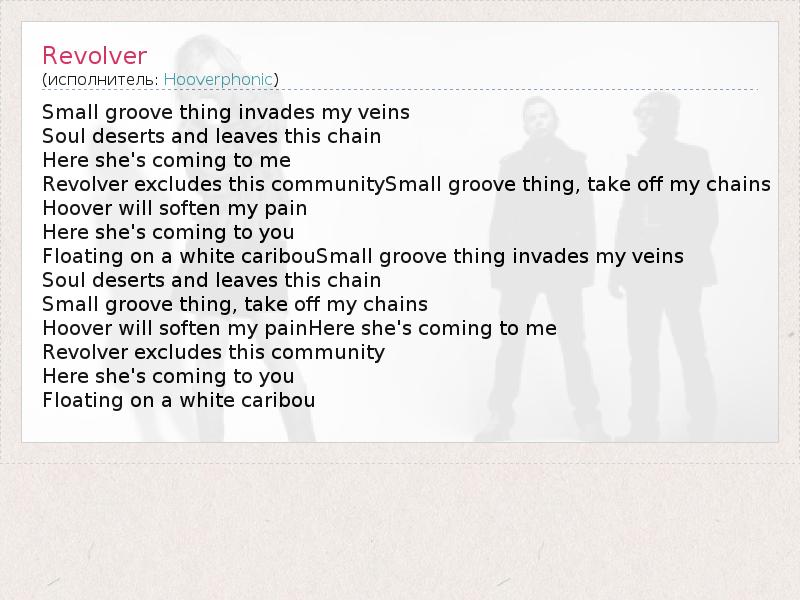 Small groove thing invades my veins Soul deserts and leaves this chain Here she's coming to me Revolver excludes this communitySmall groove thing, take off my chains Hoover will soften my pain Here she's coming to you Floating on a white caribouSmall groove thing invades my veins Soul deserts and leaves this chain Small groove thing, take off my chains Hoover will soften my painHere she's coming to me Revolver excludes this community Here she's coming to you Floating on a white caribou