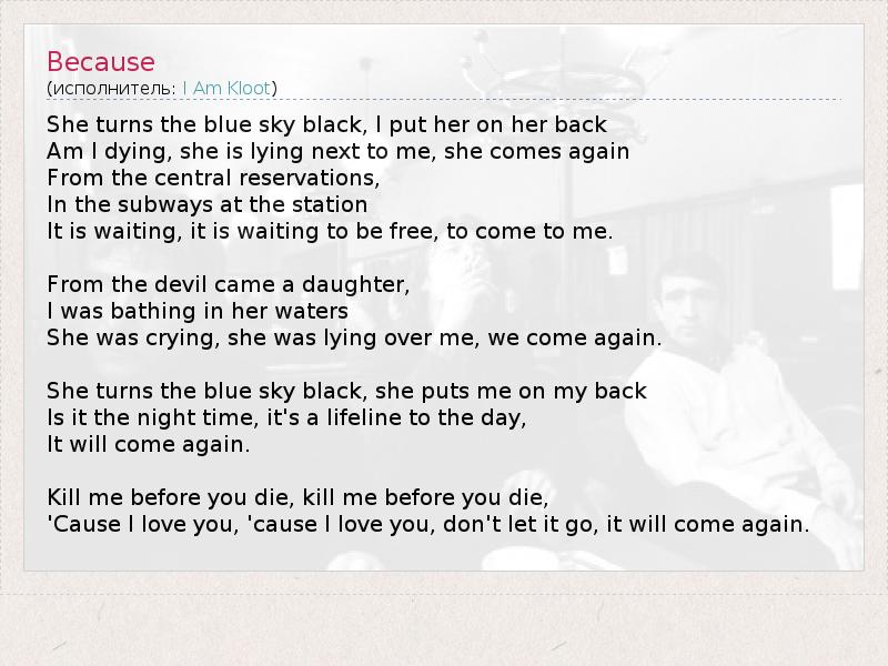 She turns the blue sky black, I put her on her back Am I dying, she is lying next to me, she comes again From the central reservations, In the subways at the station It is waiting, it is waiting to be free, to come to me. From the devil came a daughter, I was bathing in her waters She was crying, she was lying over me, we come again. She turns the blue sky black, she puts me on my back Is it the night time, it's a lifeline to the day, It will come again. Kill me before you die, kill me before you die, 'Cause I love you, 'cause I love you, don't let it go, it will come again.