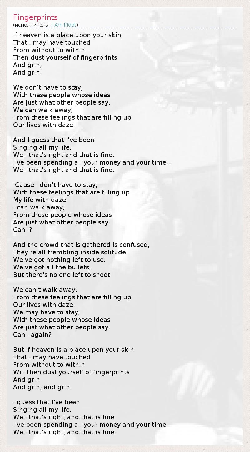If heaven is a place upon your skin, That I may have touched From without to within... Then dust yourself of fingerprints And grin, And grin. We don't have to stay, With these people whose ideas Are just what other people say. We can walk away, From these feelings that are filling up Our lives with daze. And I guess that I've been Singing all my life. Well that's right and that is fine. I've been spending all your money and your time... Well that's right and that is fine. 'Cause I don't have to stay, With these feelings that are filling up My life with daze. I can walk away, From these people whose ideas Are just what other people say. Can I? And the crowd that is gathered is confused, They're all trembling inside solitude. We've got nothing left to use. We've got all the bullets, But there's no one left to shoot. We can't walk away, From these feelings that are filling up Our lives with daze. We may have to stay, With these people whose ideas Are just what other people say. Can I again? But if heaven is a place upon your skin That I may have touched From without to within Will then dust yourself of fingerprints And grin And grin, and grin. I guess that I've been Singing all my life. Well that's right, and that is fine I've been spending all your money and your time. Well that's right, and that is fine.