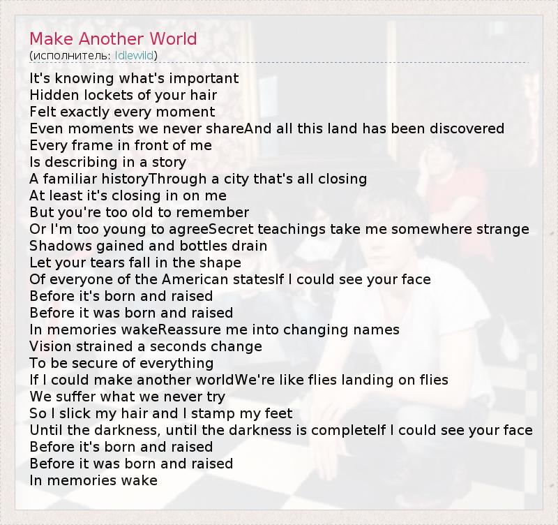 It's knowing what's important Hidden lockets of your hair Felt exactly every moment Even moments we never shareAnd all this land has been discovered Every frame in front of me Is describing in a story A familiar historyThrough a city that's all closing At least it's closing in on me But you're too old to remember Or I'm too young to agreeSecret teachings take me somewhere strange Shadows gained and bottles drain Let your tears fall in the shape Of everyone of the American statesIf I could see your face Before it's born and raised Before it was born and raised In memories wakeReassure me into changing names Vision strained a seconds change To be secure of everything If I could make another worldWe're like flies landing on flies We suffer what we never try So I slick my hair and I stamp my feet Until the darkness, until the darkness is completeIf I could see your face Before it's born and raised Before it was born and raised In memories wake