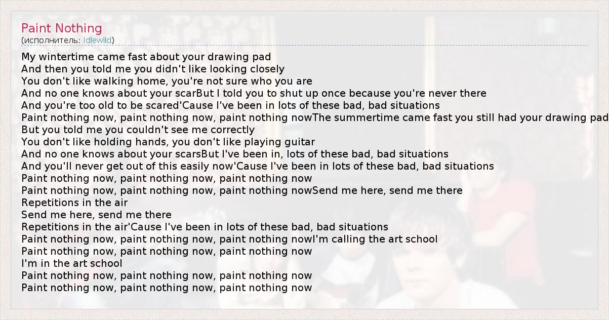 My wintertime came fast about your drawing pad And then you told me you didn't like looking closely You don't like walking home, you're not sure who you are And no one knows about your scarBut I told you to shut up once because you're never there And you're too old to be scared'Cause I've been in lots of these bad, bad situations Paint nothing now, paint nothing now, paint nothing nowThe summertime came fast you still had your drawing pad But you told me you couldn't see me correctly You don't like holding hands, you don't like playing guitar And no one knows about your scarsBut I've been in, lots of these bad, bad situations And you'll never get out of this easily now'Cause I've been in lots of these bad, bad situations Paint nothing now, paint nothing now, paint nothing now Paint nothing now, paint nothing now, paint nothing nowSend me here, send me there Repetitions in the air Send me here, send me there Repetitions in the air'Cause I've been in lots of these bad, bad situations Paint nothing now, paint nothing now, paint nothing nowI'm calling the art school Paint nothing now, paint nothing now, paint nothing now I'm in the art school Paint nothing now, paint nothing now, paint nothing now Paint nothing now, paint nothing now, paint nothing now