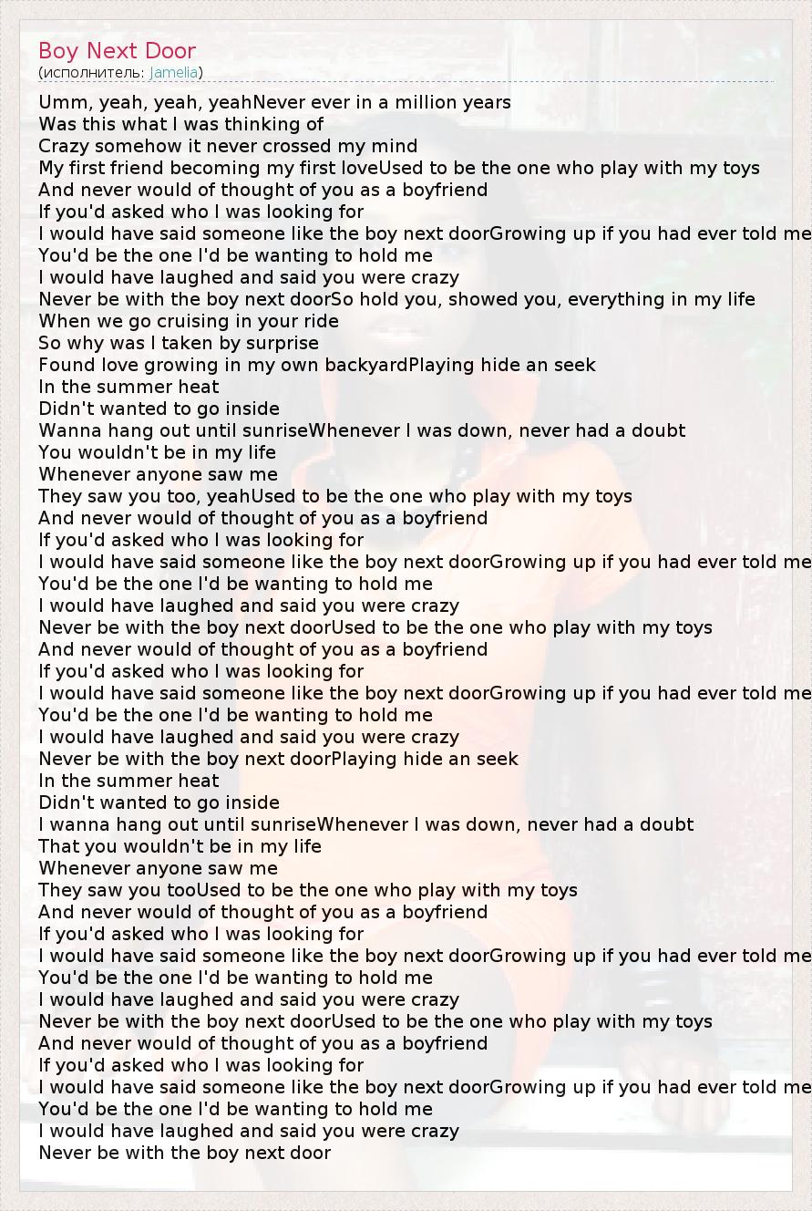 Umm, yeah, yeah, yeahNever ever in a million years Was this what I was thinking of Crazy somehow it never crossed my mind My first friend becoming my first loveUsed to be the one who play with my toys And never would of thought of you as a boyfriend If you'd asked who I was looking for I would have said someone like the boy next doorGrowing up if you had ever told me You'd be the one I'd be wanting to hold me I would have laughed and said you were crazy Never be with the boy next doorSo hold you, showed you, everything in my life When we go cruising in your ride So why was I taken by surprise Found love growing in my own backyardPlaying hide an seek In the summer heat Didn't wanted to go inside Wanna hang out until sunriseWhenever I was down, never had a doubt You wouldn't be in my life Whenever anyone saw me They saw you too, yeahUsed to be the one who play with my toys And never would of thought of you as a boyfriend If you'd asked who I was looking for I would have said someone like the boy next doorGrowing up if you had ever told me You'd be the one I'd be wanting to hold me I would have laughed and said you were crazy Never be with the boy next doorUsed to be the one who play with my toys And never would of thought of you as a boyfriend If you'd asked who I was looking for I would have said someone like the boy next doorGrowing up if you had ever told me You'd be the one I'd be wanting to hold me I would have laughed and said you were crazy Never be with the boy next doorPlaying hide an seek In the summer heat Didn't wanted to go inside I wanna hang out until sunriseWhenever I was down, never had a doubt That you wouldn't be in my life Whenever anyone saw me They saw you tooUsed to be the one who play with my toys And never would of thought of you as a boyfriend If you'd asked who I was looking for I would have said someone like the boy next doorGrowing up if you had ever told me You'd be the one I'd be wanting to hold me I would have laughed and said you were crazy Never be with the boy next doorUsed to be the one who play with my toys And never would of thought of you as a boyfriend If you'd asked who I was looking for I would have said someone like the boy next doorGrowing up if you had ever told me You'd be the one I'd be wanting to hold me I would have laughed and said you were crazy Never be with the boy next door