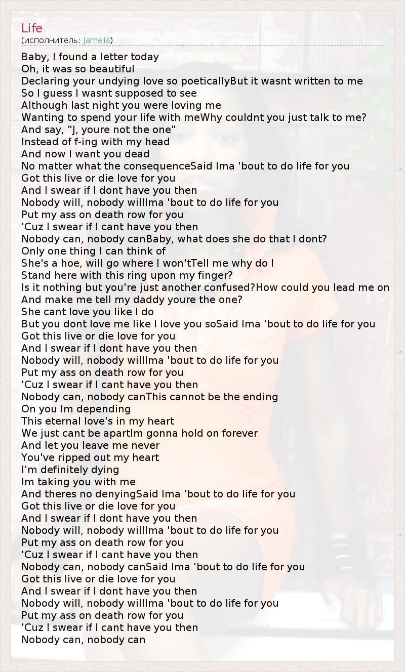 Baby, I found a letter today Oh, it was so beautiful Declaring your undying love so poeticallyBut it wasnt written to me So I guess I wasnt supposed to see Although last night you were loving me Wanting to spend your life with meWhy couldnt you just talk to me? And say, "J, youre not the one" Instead of f-ing with my head And now I want you dead No matter what the consequenceSaid Ima 'bout to do life for you Got this live or die love for you And I swear if I dont have you then Nobody will, nobody willIma 'bout to do life for you Put my ass on death row for you 'Cuz I swear if I cant have you then Nobody can, nobody canBaby, what does she do that I dont? Only one thing I can think of She's a hoe, will go where I won'tTell me why do I Stand here with this ring upon my finger? Is it nothing but you're just another confused?How could you lead me on And make me tell my daddy youre the one? She cant love you like I do But you dont love me like I love you soSaid Ima 'bout to do life for you Got this live or die love for you And I swear if I dont have you then Nobody will, nobody willIma 'bout to do life for you Put my ass on death row for you 'Cuz I swear if I cant have you then Nobody can, nobody canThis cannot be the ending On you Im depending This eternal love's in my heart We just cant be apartIm gonna hold on forever And let you leave me never You've ripped out my heart I'm definitely dying Im taking you with me And theres no denyingSaid Ima 'bout to do life for you Got this live or die love for you And I swear if I dont have you then Nobody will, nobody willIma 'bout to do life for you Put my ass on death row for you 'Cuz I swear if I cant have you then Nobody can, nobody canSaid Ima 'bout to do life for you Got this live or die love for you And I swear if I dont have you then Nobody will, nobody willIma 'bout to do life for you Put my ass on death row for you 'Cuz I swear if I cant have you then Nobody can, nobody can