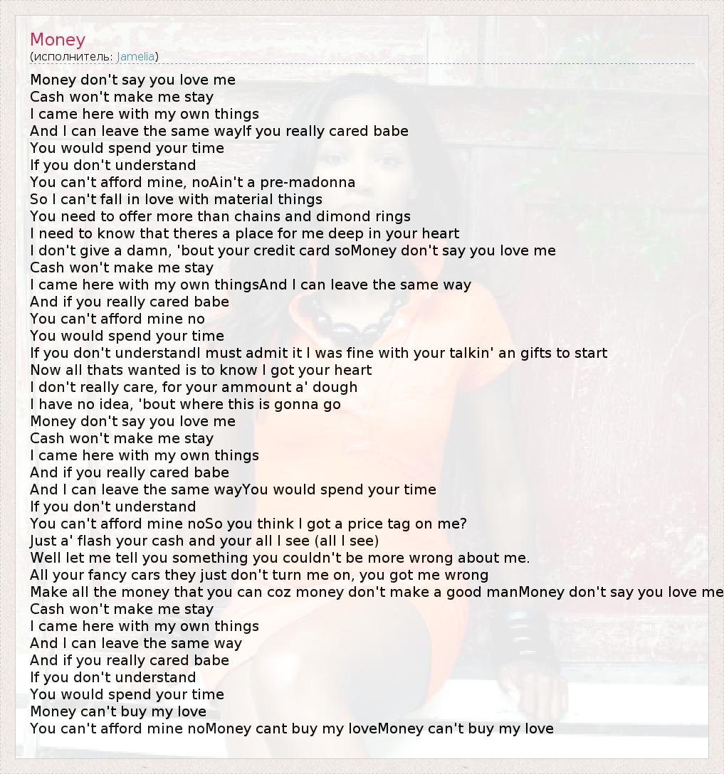 Money don't say you love me Cash won't make me stay I came here with my own things And I can leave the same wayIf you really cared babe You would spend your time If you don't understand You can't afford mine, noAin't a pre-madonna So I can't fall in love with material things You need to offer more than chains and dimond rings I need to know that theres a place for me deep in your heart I don't give a damn, 'bout your credit card soMoney don't say you love me Cash won't make me stay I came here with my own thingsAnd I can leave the same way And if you really cared babe You can't afford mine no You would spend your time If you don't understandI must admit it I was fine with your talkin' an gifts to start Now all thats wanted is to know I got your heart I don't really care, for your ammount a' dough I have no idea, 'bout where this is gonna go Money don't say you love me Cash won't make me stay I came here with my own things And if you really cared babe And I can leave the same wayYou would spend your time If you don't understand You can't afford mine noSo you think I got a price tag on me? Just a' flash your cash and your all I see (all I see) Well let me tell you something you couldn't be more wrong about me. All your fancy cars they just don't turn me on, you got me wrong Make all the money that you can coz money don't make a good manMoney don't say you love me Cash won't make me stay I came here with my own things And I can leave the same way And if you really cared babe If you don't understand You would spend your time Money can't buy my love You can't afford mine noMoney cant buy my loveMoney can't buy my love