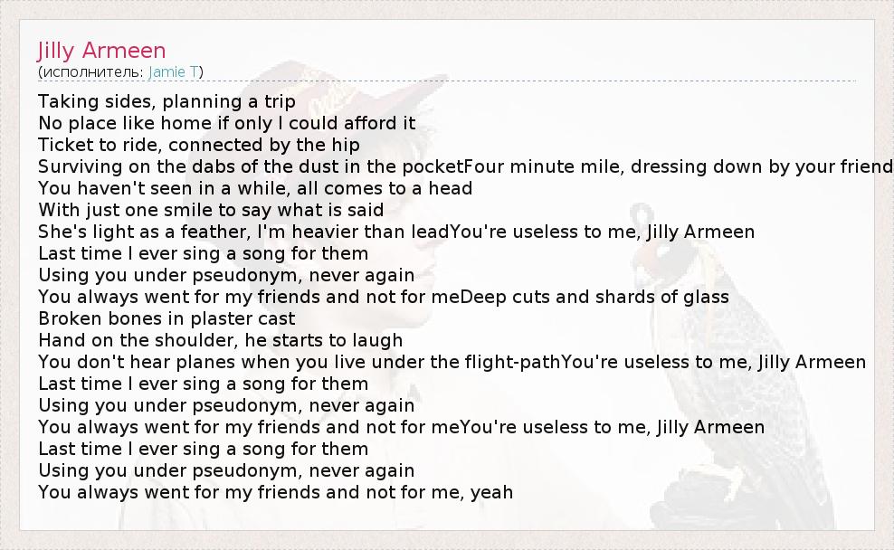 Taking sides, planning a trip No place like home if only I could afford it Ticket to ride, connected by the hip Surviving on the dabs of the dust in the pocketFour minute mile, dressing down by your friend You haven't seen in a while, all comes to a head With just one smile to say what is said She's light as a feather, I'm heavier than leadYou're useless to me, Jilly Armeen Last time I ever sing a song for them Using you under pseudonym, never again You always went for my friends and not for meDeep cuts and shards of glass Broken bones in plaster cast Hand on the shoulder, he starts to laugh You don't hear planes when you live under the flight-pathYou're useless to me, Jilly Armeen Last time I ever sing a song for them Using you under pseudonym, never again You always went for my friends and not for meYou're useless to me, Jilly Armeen Last time I ever sing a song for them Using you under pseudonym, never again You always went for my friends and not for me, yeah