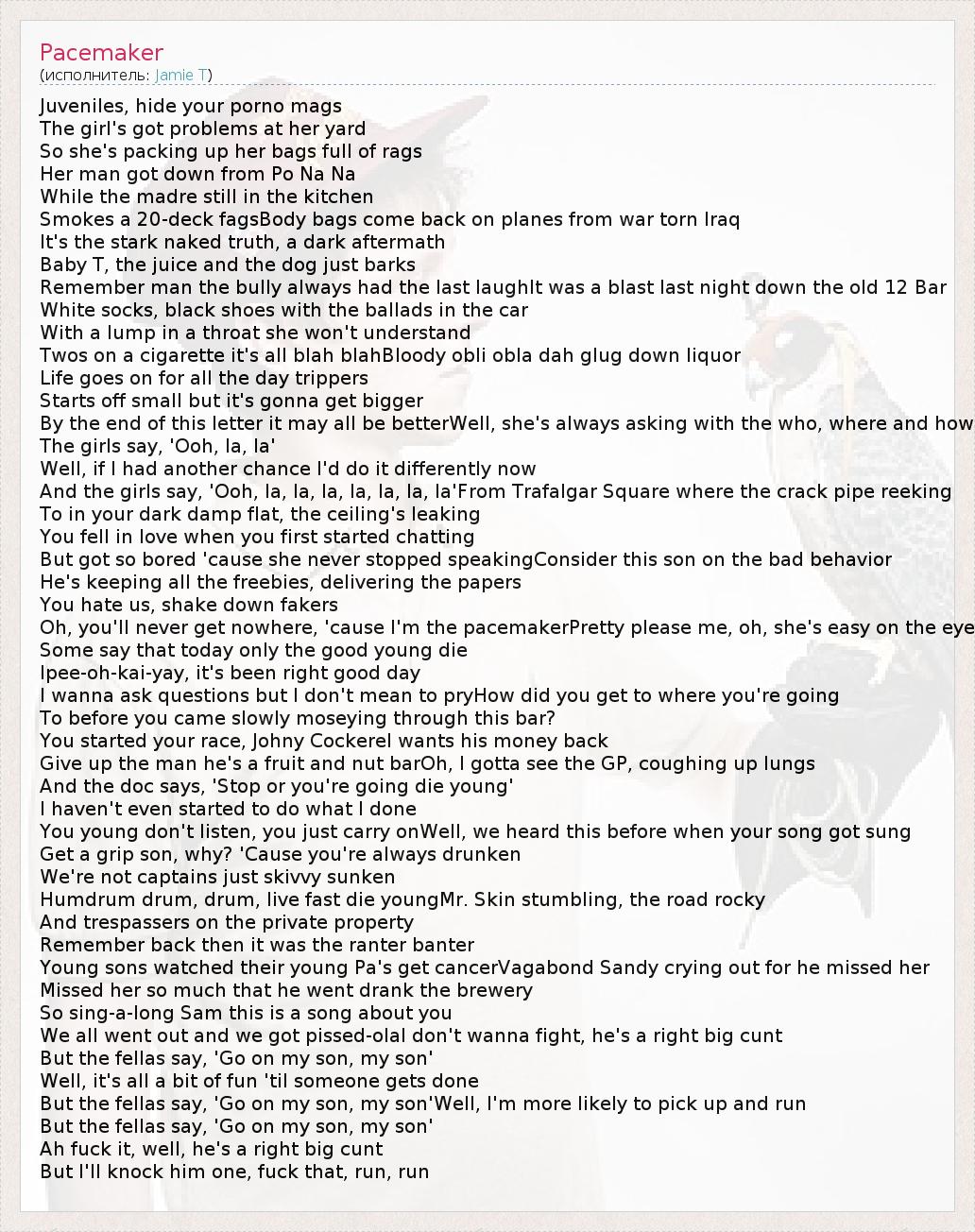 Juveniles, hide your porno mags The girl's got problems at her yard So she's packing up her bags full of rags Her man got down from Po Na Na While the madre still in the kitchen Smokes a 20-deck fagsBody bags come back on planes from war torn Iraq It's the stark naked truth, a dark aftermath Baby T, the juice and the dog just barks Remember man the bully always had the last laughIt was a blast last night down the old 12 Bar White socks, black shoes with the ballads in the car With a lump in a throat she won't understand Twos on a cigarette it's all blah blahBloody obli obla dah glug down liquor Life goes on for all the day trippers Starts off small but it's gonna get bigger By the end of this letter it may all be betterWell, she's always asking with the who, where and how The girls say, 'Ooh, la, la' Well, if I had another chance I'd do it differently now And the girls say, 'Ooh, la, la, la, la, la, la, la'From Trafalgar Square where the crack pipe reeking To in your dark damp flat, the ceiling's leaking You fell in love when you first started chatting But got so bored 'cause she never stopped speakingConsider this son on the bad behavior He's keeping all the freebies, delivering the papers You hate us, shake down fakers Oh, you'll never get nowhere, 'cause I'm the pacemakerPretty please me, oh, she's easy on the eye Some say that today only the good young die Ipee-oh-kai-yay, it's been right good day I wanna ask questions but I don't mean to pryHow did you get to where you're going To before you came slowly moseying through this bar? You started your race, Johny Cockerel wants his money back Give up the man he's a fruit and nut barOh, I gotta see the GP, coughing up lungs And the doc says, 'Stop or you're going die young' I haven't even started to do what I done You young don't listen, you just carry onWell, we heard this before when your song got sung Get a grip son, why? 'Cause you're always drunken We're not captains just skivvy sunken Humdrum drum, drum, live fast die youngMr. Skin stumbling, the road rocky And trespassers on the private property Remember back then it was the ranter banter Young sons watched their young Pa's get cancerVagabond Sandy crying out for he missed her Missed her so much that he went drank the brewery So sing-a-long Sam this is a song about you We all went out and we got pissed-olaI don't wanna fight, he's a right big cunt But the fellas say, 'Go on my son, my son' Well, it's all a bit of fun 'til someone gets done But the fellas say, 'Go on my son, my son'Well, I'm more likely to pick up and run But the fellas say, 'Go on my son, my son' Ah fuck it, well, he's a right big cunt But I'll knock him one, fuck that, run, run