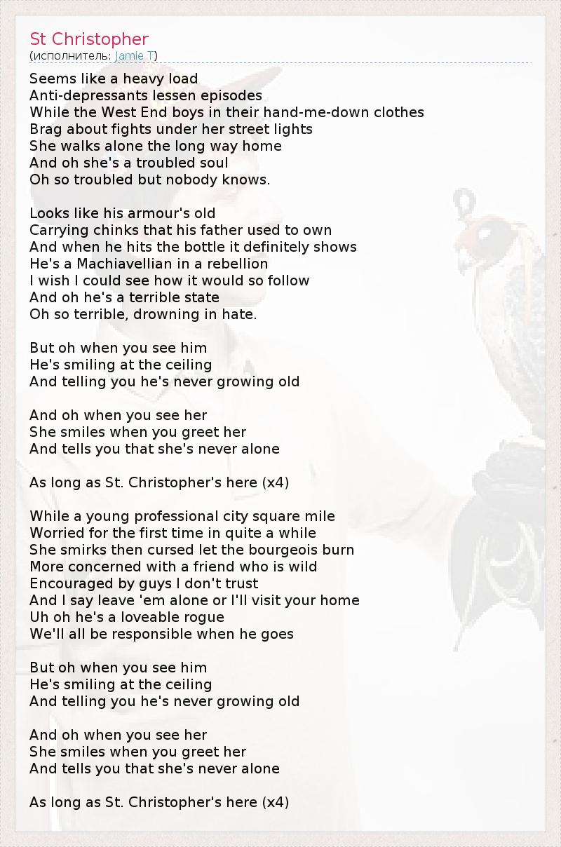 Seems like a heavy load Anti-depressants lessen episodes While the West End boys in their hand-me-down clothes Brag about fights under her street lights She walks alone the long way home And oh she's a troubled soul Oh so troubled but nobody knows. Looks like his armour's old Carrying chinks that his father used to own And when he hits the bottle it definitely shows He's a Machiavellian in a rebellion I wish I could see how it would so follow And oh he's a terrible state Oh so terrible, drowning in hate. But oh when you see him He's smiling at the ceiling And telling you he's never growing old And oh when you see her She smiles when you greet her And tells you that she's never alone As long as St. Christopher's here (x4) While a young professional city square mile Worried for the first time in quite a while She smirks then cursed let the bourgeois burn More concerned with a friend who is wild Encouraged by guys I don't trust And I say leave 'em alone or I'll visit your home Uh oh he's a loveable rogue We'll all be responsible when he goes But oh when you see him He's smiling at the ceiling And telling you he's never growing old And oh when you see her She smiles when you greet her And tells you that she's never alone As long as St. Christopher's here (x4)
