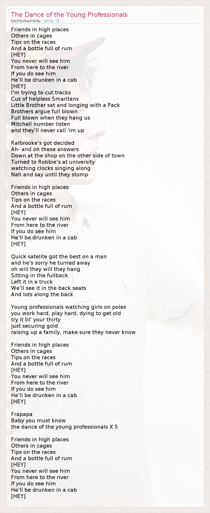 Friends in high places Others in cages Tips on the races And a bottle full of rum [HEY] You never will see him From here to the river If you do see him He'll be drunken in a cab [HEY] I'm trying to cut tracks Cus of helpless Smaritans Little Brother sat and longing with a Pack Brothers argue full blown Full blown when they hang us Mitchell number listen and they'll never call 'im up Ralbrooke's got decided Ah- and oh these answers Down at the shop on the other side of town Turned to Robbie's at university watching clocks singing along Nah and say until they stomp Friends in high places Others in cages Tips on the races And a bottle full of rum [HEY] You never will see him From here to the river If you do see him He'll be drunken in a cab [HEY] Quick satelite got the best on a man and he's sorry he turned away oh will they will they hang Sitting in the fullback Left it in a truck We'll see it in the back seats And lots along the back Young professionals watching girls on poles you work hard, play hard, dying to get old try it til' your thirty just securing gold raising up a family, make sure they never know Friends in high places Others in cages Tips on the races And a bottle full of rum [HEY] You never will see him From here to the river If you do see him He'll be drunken in a cab [HEY] Frapapa Baby you must know the dance of the young professionals X 5 Friends in high places Others in cages Tips on the races And a bottle full of rum [HEY] You never will see him From here to the river If you do see him He'll be drunken in a cab [HEY]