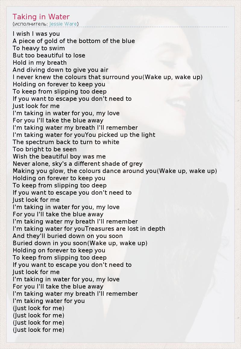 I wish I was you A piece of gold of the bottom of the blue To heavy to swim But too beautiful to lose Hold in my breath And diving down to give you air I never knew the colours that surround you(Wake up, wake up) Holding on forever to keep you To keep from slipping too deep If you want to escape you don't need to Just look for me I'm taking in water for you, my love For you I'll take the blue away I'm taking water my breath I'll remember I'm taking water for youYou picked up the light The spectrum back to turn to white Too bright to be seen Wish the beautiful boy was me Never alone, sky's a different shade of grey Making you glow, the colours dance around you(Wake up, wake up) Holding on forever to keep you To keep from slipping too deep If you want to escape you don't need to Just look for me I'm taking in water for you, my love For you I'll take the blue away I'm taking water my breath I'll remember I'm taking water for youTreasures are lost in depth And they'll buried down on you soon Buried down in you soon(Wake up, wake up) Holding on forever to keep you To keep from slipping too deep If you want to escape you don't need to Just look for me I'm taking in water for you, my love For you I'll take the blue away I'm taking water my breath I'll remember I'm taking water for you (Just look for me) (Just look for me) (Just look for me) (Just look for me)