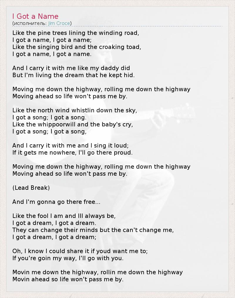 Like the pine trees lining the winding road, I got a name, I got a name; Like the singing bird and the croaking toad, I got a name, I got a name. And I carry it with me like my daddy did But I'm living the dream that he kept hid. Moving me down the highway, rolling me down the highway Moving ahead so life won't pass me by. Like the north wind whistlin down the sky, I got a song; I got a song. Like the whippoorwill and the baby's cry, I got a song; I got a song, And I carry it with me and I sing it loud; If it gets me nowhere, I'll go there proud. Moving me down the highway, rolling me down the highway Moving ahead so life won't pass me by. (Lead Break) And I'm gonna go there free... Like the fool I am and Ill always be, I got a dream, I got a dream. They can change their minds but the can't change me, I got a dream, I got a dream; Oh, I know I could share it if youd want me to; If you're goin my way, I'll go with you. Movin me down the highway, rollin me down the highway Movin ahead so life won't pass me by.