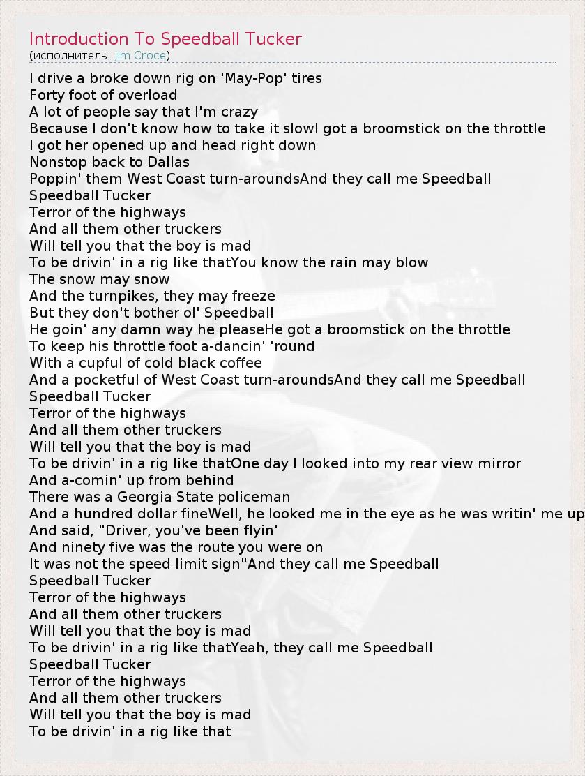 I drive a broke down rig on 'May-Pop' tires Forty foot of overload A lot of people say that I'm crazy Because I don't know how to take it slowI got a broomstick on the throttle I got her opened up and head right down Nonstop back to Dallas Poppin' them West Coast turn-aroundsAnd they call me Speedball Speedball Tucker Terror of the highways And all them other truckers Will tell you that the boy is mad To be drivin' in a rig like thatYou know the rain may blow The snow may snow And the turnpikes, they may freeze But they don't bother ol' Speedball He goin' any damn way he pleaseHe got a broomstick on the throttle To keep his throttle foot a-dancin' 'round With a cupful of cold black coffee And a pocketful of West Coast turn-aroundsAnd they call me Speedball Speedball Tucker Terror of the highways And all them other truckers Will tell you that the boy is mad To be drivin' in a rig like thatOne day I looked into my rear view mirror And a-comin' up from behind There was a Georgia State policeman And a hundred dollar fineWell, he looked me in the eye as he was writin' me up And said, "Driver, you've been flyin' And ninety five was the route you were on It was not the speed limit sign"And they call me Speedball Speedball Tucker Terror of the highways And all them other truckers Will tell you that the boy is mad To be drivin' in a rig like thatYeah, they call me Speedball Speedball Tucker Terror of the highways And all them other truckers Will tell you that the boy is mad To be drivin' in a rig like that