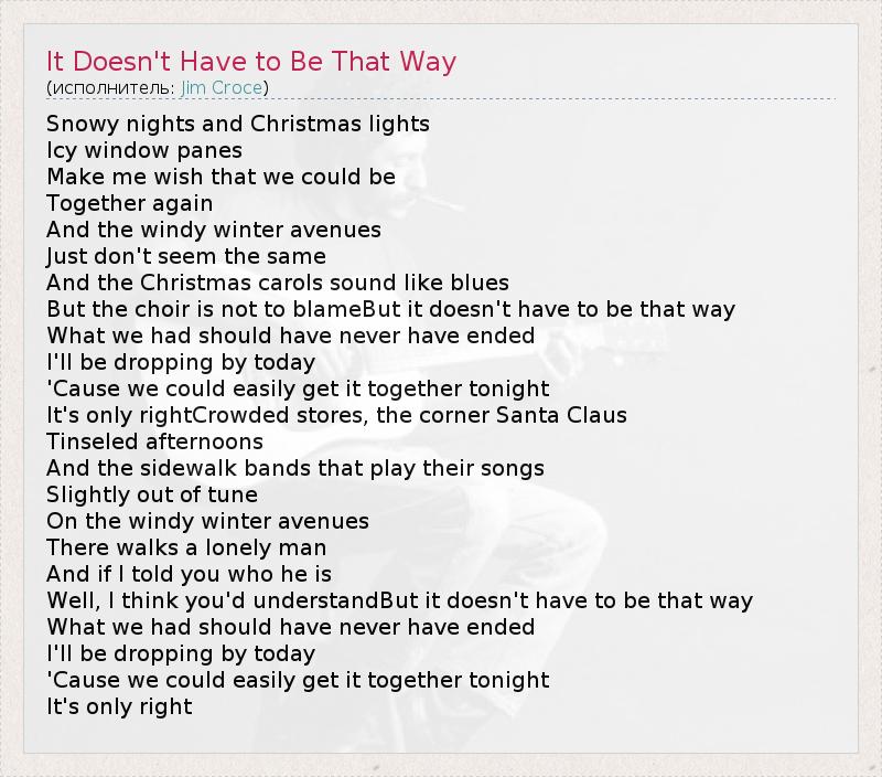 Snowy nights and Christmas lights Icy window panes Make me wish that we could be Together again And the windy winter avenues Just don't seem the same And the Christmas carols sound like blues But the choir is not to blameBut it doesn't have to be that way What we had should have never have ended I'll be dropping by today 'Cause we could easily get it together tonight It's only rightCrowded stores, the corner Santa Claus Tinseled afternoons And the sidewalk bands that play their songs Slightly out of tune On the windy winter avenues There walks a lonely man And if I told you who he is Well, I think you'd understandBut it doesn't have to be that way What we had should have never have ended I'll be dropping by today 'Cause we could easily get it together tonight It's only right