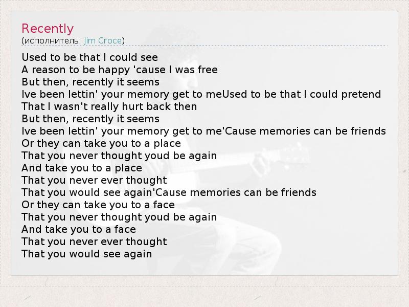 Used to be that I could see A reason to be happy 'cause I was free But then, recently it seems Ive been lettin' your memory get to meUsed to be that I could pretend That I wasn't really hurt back then But then, recently it seems Ive been lettin' your memory get to me'Cause memories can be friends Or they can take you to a place That you never thought youd be again And take you to a place That you never ever thought That you would see again'Cause memories can be friends Or they can take you to a face That you never thought youd be again And take you to a face That you never ever thought That you would see again
