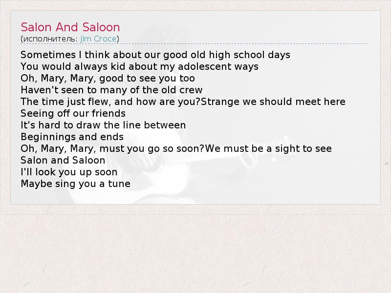 Sometimes I think about our good old high school days You would always kid about my adolescent ways Oh, Mary, Mary, good to see you too Haven't seen to many of the old crew The time just flew, and how are you?Strange we should meet here Seeing off our friends It's hard to draw the line between Beginnings and ends Oh, Mary, Mary, must you go so soon?We must be a sight to see Salon and Saloon I'll look you up soon Maybe sing you a tune