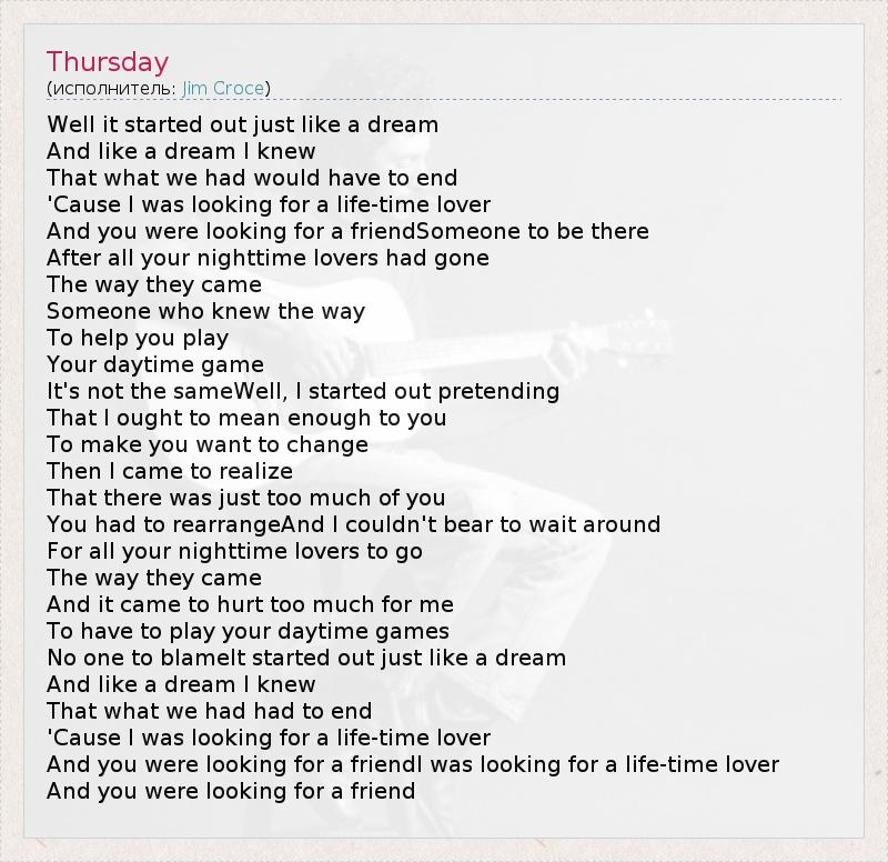 Well it started out just like a dream And like a dream I knew That what we had would have to end 'Cause I was looking for a life-time lover And you were looking for a friendSomeone to be there After all your nighttime lovers had gone The way they came Someone who knew the way To help you play Your daytime game It's not the sameWell, I started out pretending That I ought to mean enough to you To make you want to change Then I came to realize That there was just too much of you You had to rearrangeAnd I couldn't bear to wait around For all your nighttime lovers to go The way they came And it came to hurt too much for me To have to play your daytime games No one to blameIt started out just like a dream And like a dream I knew That what we had had to end 'Cause I was looking for a life-time lover And you were looking for a friendI was looking for a life-time lover And you were looking for a friend