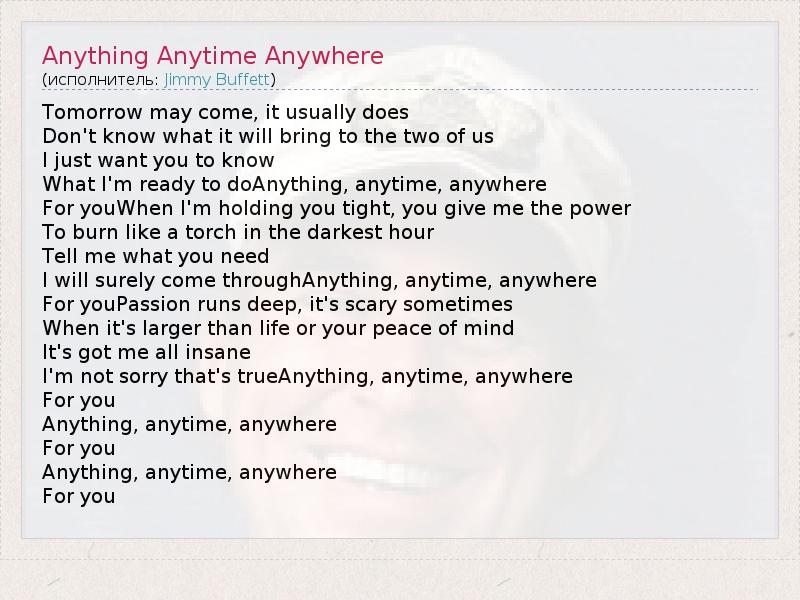 Tomorrow may come, it usually does Don't know what it will bring to the two of us I just want you to know What I'm ready to doAnything, anytime, anywhere For youWhen I'm holding you tight, you give me the power To burn like a torch in the darkest hour Tell me what you need I will surely come throughAnything, anytime, anywhere For youPassion runs deep, it's scary sometimes When it's larger than life or your peace of mind It's got me all insane I'm not sorry that's trueAnything, anytime, anywhere For you Anything, anytime, anywhere For you Anything, anytime, anywhere For you