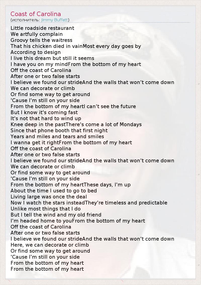 Little roadside restaurant We artfully complain Groovy tells the waitress That his chicken died in vainMost every day goes by According to design I live this dream but still it seems I have you on my mindFrom the bottom of my heart Off the coast of Carolina After one or two false starts I believe we found our strideAnd the walls that won't come down We can decorate or climb Or find some way to get around 'Cause I'm still on your side From the bottom of my heartI can't see the future But I know it's coming fast It's not that hard to wind up Knee deep in the pastThere's come a lot of Mondays Since that phone booth that first night Years and miles and tears and smiles I wanna get it rightFrom the bottom of my heart Off the coast of Carolina After one or two false starts I believe we found our strideAnd the walls that won't come down We can decorate or climb Or find some way to get around 'Cause I'm still on your side From the bottom of my heartThese days, I'm up About the time I used to go to bed Living large was once the deal Now I watch the stars insteadThey're timeless and predictable Unlike most things that I do But I tell the wind and my old friend I'm headed home to youFrom the bottom of my heart Off the coast of Carolina After one or two false starts I believe we found our strideAnd the walls that won't come down Here, we can decorate or climb Or find some way to get around 'Cause I'm still on your side From the bottom of my heart From the bottom of my heart