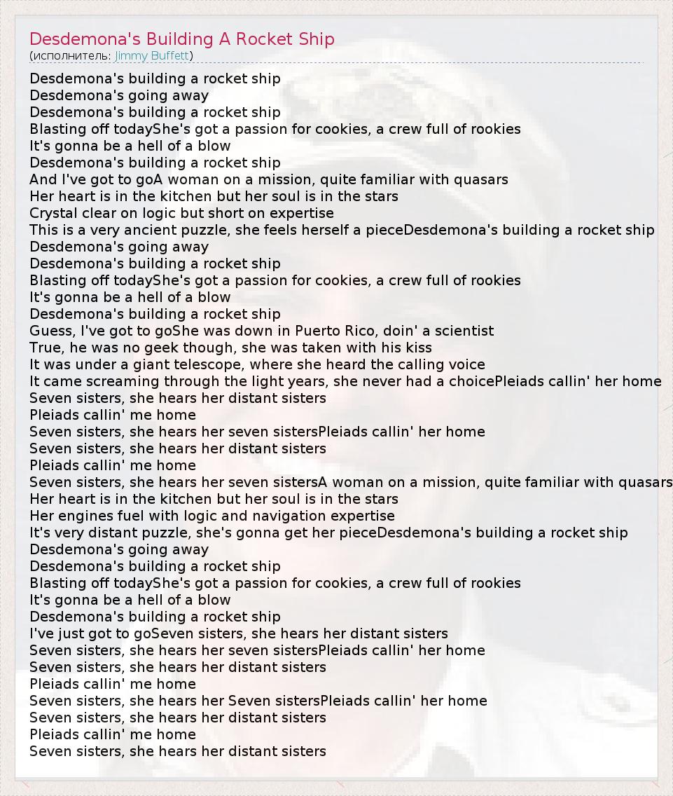 А как ты думаешь, о чем песня "Desdemona's Building A Rocket Ship" ?