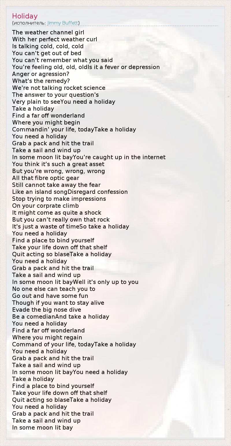 The weather channel girl With her perfect weather curl Is talking cold, cold, cold You can't get out of bed You can't remember what you said You're feeling old, old, oldIs it a fever or depression Anger or agression? What's the remedy? We're not talking rocket science The answer to your question's Very plain to seeYou need a holiday Take a holiday Find a far off wonderland Where you might begin Commandin' your life, todayTake a holiday You need a holiday Grab a pack and hit the trail Take a sail and wind up In some moon lit bayYou're caught up in the internet You think it's such a great asset But you're wrong, wrong, wrong All that fibre optic gear Still cannot take away the fear Like an island songDisregard confession Stop trying to make impressions On your corprate climb It might come as quite a shock But you can't really own that rock It's just a waste of timeSo take a holiday You need a holiday Find a place to bind yourself Take your life down off that shelf Quit acting so blaseTake a holiday You need a holiday Grab a pack and hit the trail Take a sail and wind up In some moon lit bayWell it's only up to you No one else can teach you to Go out and have some fun Though if you want to stay alive Evade the big nose dive Be a comedianAnd take a holiday You need a holiday Find a far off wonderland Where you might regain Command of your life, todayTake a holiday You need a holiday Grab a pack and hit the trail Take a sail and wind up In some moon lit bayYou need a holiday Take a holiday Find a place to bind yourself Take your life down off that shelf Quit acting so blaseTake a holiday You need a holiday Grab a pack and hit the trail Take a sail and wind up In some moon lit bay