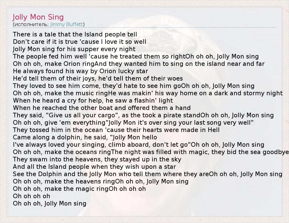 There is a tale that the Island people tell Don't care if it is true 'cause I love it so well Jolly Mon sing for his supper every night The people fed him well 'cause he treated them so rightOh oh oh, Jolly Mon sing Oh oh oh, make Orion ringAnd they wanted him to sing on the island near and far He always found his way by Orion lucky star He'd tell them of their joys, he'd tell them of their woes They loved to see him come, they'd hate to see him goOh oh oh, Jolly Mon sing Oh oh oh, make the music ringHe was makin' his way home on a dark and stormy night When he heard a cry for help, he saw a flashin' light When he reached the other boat and offered them a hand They said, "Give us all your cargo", as the took a pirate standOh oh oh, Jolly Mon sing Oh oh oh, give 'em everything"Jolly Mon it's over sing your last song very well" They tossed him in the ocean 'cause their hearts were made in Hell Came along a dolphin, he said, "Jolly Mon hello I've always loved your singing, climb aboard, don't let go"Oh oh oh, Jolly Mon sing Oh oh oh, make the oceans ringThe night was filled with magic, they bid the sea goodbye They swam into the heavens, they stayed up in the sky And all the Island people when they wish upon a star See the Dolphin and the Jolly Mon who tell them where they areOh oh oh, Jolly Mon sing Oh oh oh, make the heavens ringOh oh oh, Jolly Mon sing Oh oh oh, make the magic ringOh oh oh oh Oh oh oh oh Oh oh oh, Jolly Mon sing