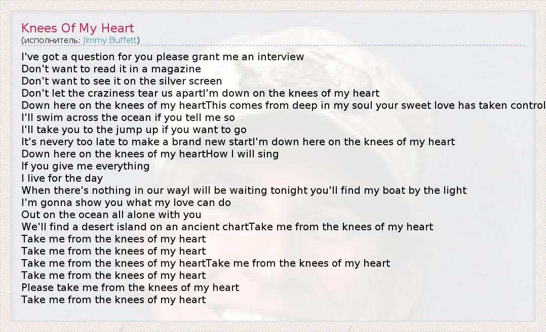 I've got a question for you please grant me an interview Don't want to read it in a magazine Don't want to see it on the silver screen Don't let the craziness tear us apartI'm down on the knees of my heart Down here on the knees of my heartThis comes from deep in my soul your sweet love has taken control I'll swim across the ocean if you tell me so I'll take you to the jump up if you want to go It's nevery too late to make a brand new startI'm down here on the knees of my heart Down here on the knees of my heartHow I will sing If you give me everything I live for the day When there's nothing in our wayI will be waiting tonight you'll find my boat by the light I'm gonna show you what my love can do Out on the ocean all alone with you We'll find a desert island on an ancient chartTake me from the knees of my heart Take me from the knees of my heart Take me from the knees of my heart Take me from the knees of my heartTake me from the knees of my heart Take me from the knees of my heart Please take me from the knees of my heart Take me from the knees of my heart