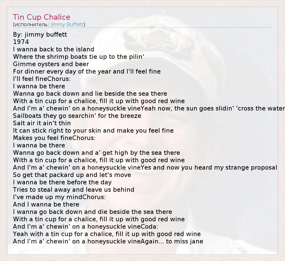 А как ты думаешь, о чем песня "Tin Cup Chalice" ?