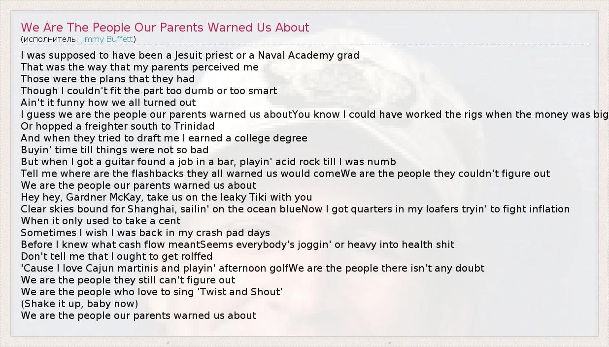 I was supposed to have been a Jesuit priest or a Naval Academy grad That was the way that my parents perceived me Those were the plans that they had Though I couldn't fit the part too dumb or too smart Ain't it funny how we all turned out I guess we are the people our parents warned us aboutYou know I could have worked the rigs when the money was big Or hopped a freighter south to Trinidad And when they tried to draft me I earned a college degree Buyin' time till things were not so bad But when I got a guitar found a job in a bar, playin' acid rock till I was numb Tell me where are the flashbacks they all warned us would comeWe are the people they couldn't figure out We are the people our parents warned us about Hey hey, Gardner McKay, take us on the leaky Tiki with you Clear skies bound for Shanghai, sailin' on the ocean blueNow I got quarters in my loafers tryin' to fight inflation When it only used to take a cent Sometimes I wish I was back in my crash pad days Before I knew what cash flow meantSeems everybody's joggin' or heavy into health shit Don't tell me that I ought to get rolffed 'Cause I love Cajun martinis and playin' afternoon golfWe are the people there isn't any doubt We are the people they still can't figure out We are the people who love to sing 'Twist and Shout' (Shake it up, baby now) We are the people our parents warned us about