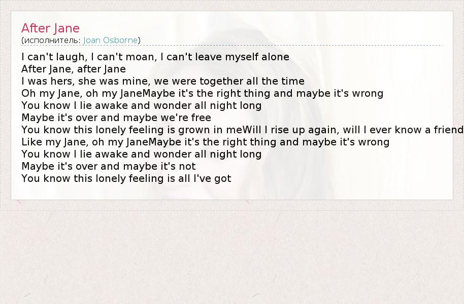 I can't laugh, I can't moan, I can't leave myself alone After Jane, after Jane I was hers, she was mine, we were together all the time Oh my Jane, oh my JaneMaybe it's the right thing and maybe it's wrong You know I lie awake and wonder all night long Maybe it's over and maybe we're free You know this lonely feeling is grown in meWill I rise up again, will I ever know a friend Like my Jane, oh my JaneMaybe it's the right thing and maybe it's wrong You know I lie awake and wonder all night long Maybe it's over and maybe it's not You know this lonely feeling is all I've got